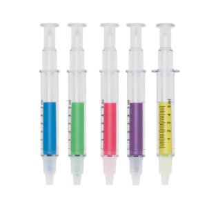 Descrição: Caneta seringa marca texto CB 006 plástica esferográfica. Possui medidor imitando uma seringa e tampa protetora nas duas pontas.