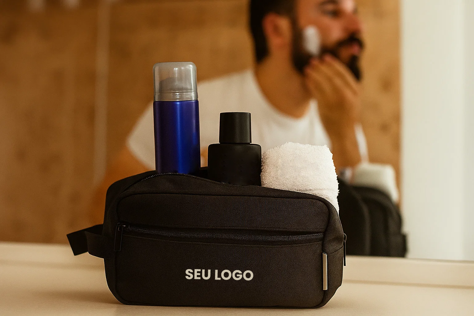 Brindes que incentivam o autocuidado têm ganhado cada vez mais espaço. Portanto, uma nécessaire com produtos como creme de barbear, loção pós-barba e toalha personalizada é uma escolha certeira.