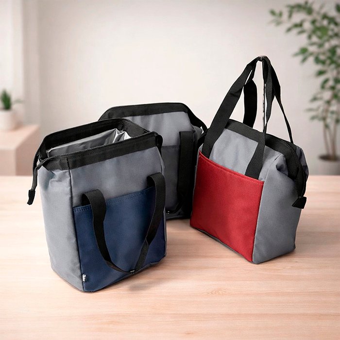 Em segundo lugar, sua estrutura otimiza a conservação térmica, pois conta com revestimento interno antivazamento e fechamento em zíper, assegurando maior eficiência no transporte de alimentos e bebidas. Dessa forma, o bolso frontal em rPET agrega apelo sustentável, enquanto as alças com botão aumentam o conforto no manuseio.