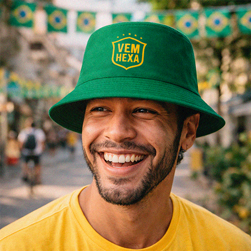 Descrição: Bucket Hat Copa do Mundo apresenta design moderno, urbano e altamente versátil, sendo amplamente utilizado em ações promocionais, eventos e campanhas de branding que exigem forte apelo visual e conexão com tendências atuais. Com estrutura maleável, sem rigidez, formato circular e abas inclinadas com costuras aparentes, oferece conforto, proteção solar funcional e excelente ajuste à cabeça, além de ser leve, prático e fácil de transportar. Confeccionado em materiais como brim, sarja, algodão, poliéster ou tecidos tecnológicos, valoriza a personalização da marca por meio de bordados, patches, silk ou estampas, entregando alto valor percebido e reforçando o posicionamento da marca em ativações estratégicas e experiências promocionais.