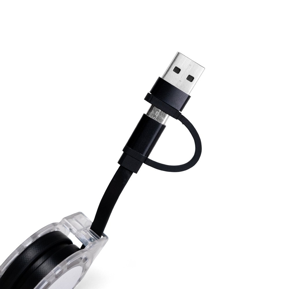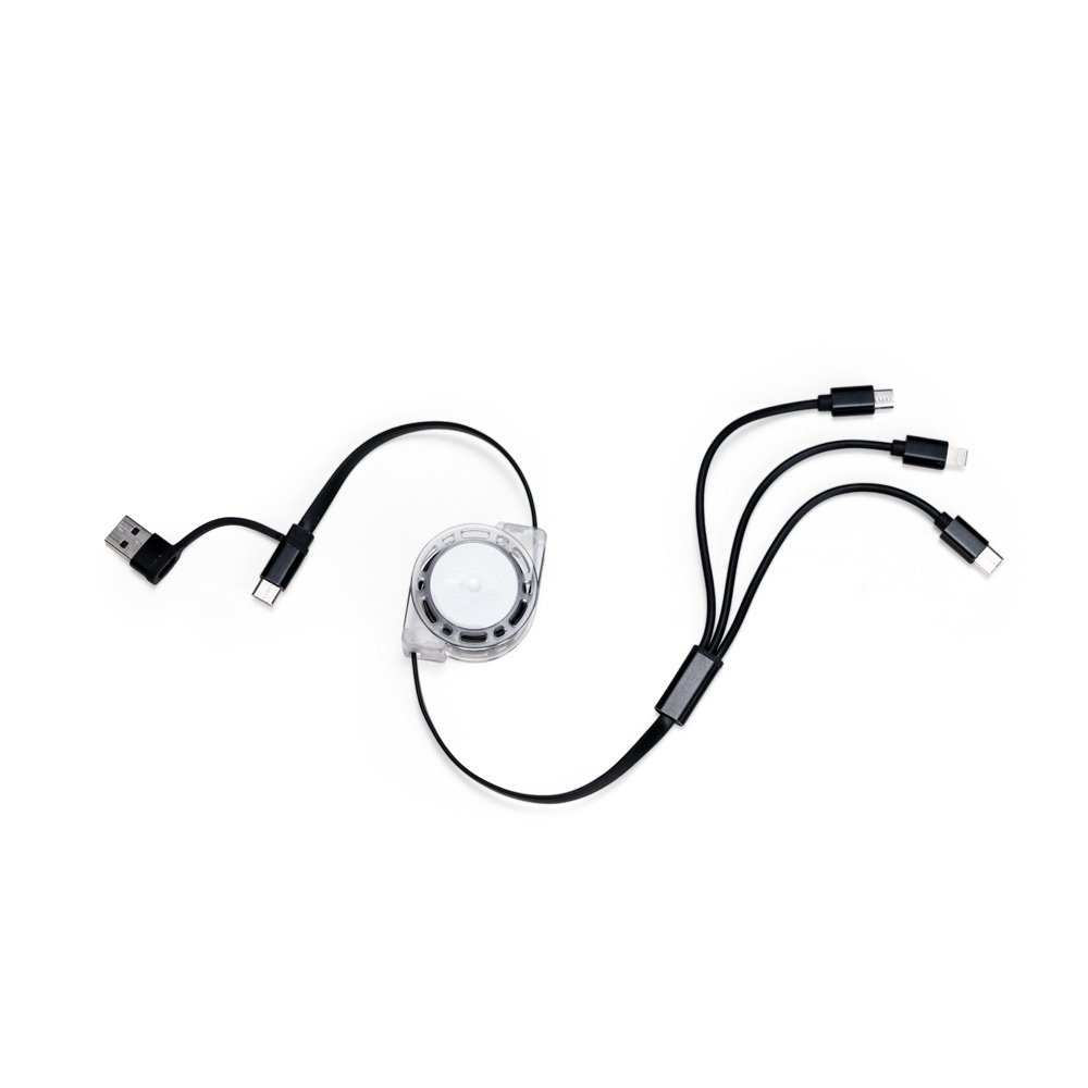Descrição: Cabo retrátil 3 em 1 CB 9287 USB com níveis ajustáveis e extensão de até 1,05 m. Apresenta três cabos com saídas USB-C, Micro USB e Lightning em uma das pontas, enquanto a outra conta com entrada USB-C e adaptador USB tipo A. Obs.: A transferência de arquivos e dados em dispositivos Android funciona apenas pela saída USB-C.