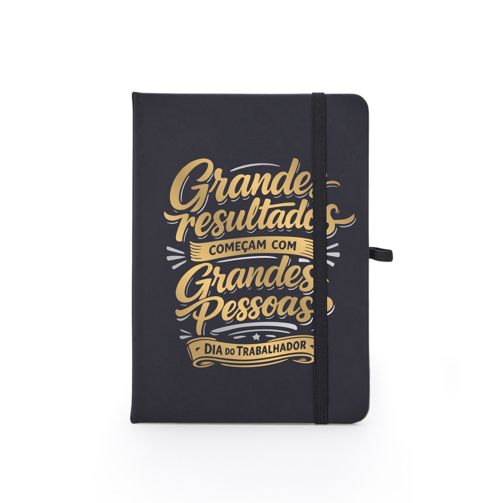 Descrição: Caderneta emborrachada Dia do Trabalhador com suporte para caneta, elástico para lacre e marcador de página em cetim, contém aproximadamente 80 folhas com pauta na cor branca.