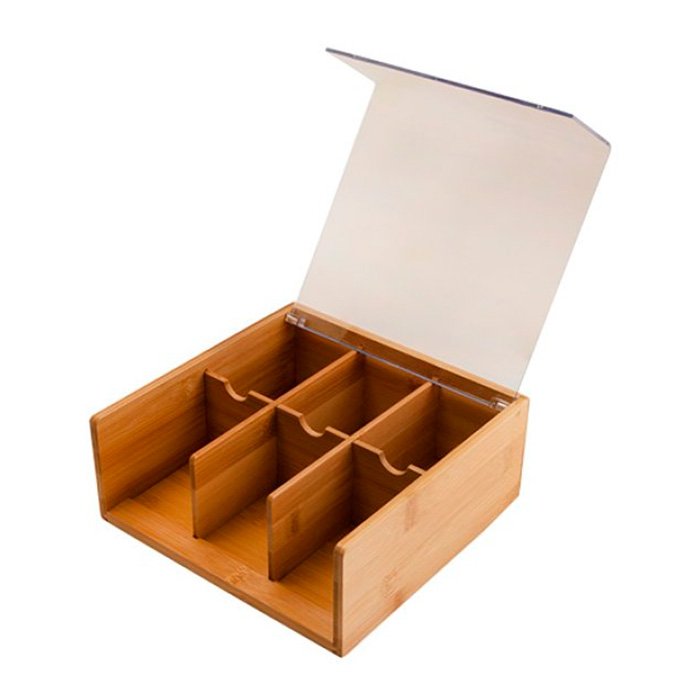 Descrição: Caixa de chá 6 nichos CB 7576 é produzida com estrutura em bambu e tampa em plástico PS transparente, oferecendo resistência, durabilidade e visual clean. Conta com seis nichos internos que facilitam a organização de sachês e pequenos itens, mantendo tudo visível e bem distribuído. O design funcional permite fácil acesso ao conteúdo, enquanto a combinação dos materiais garante praticidade na limpeza e um acabamento elegante, ideal para uso em cozinhas, escritórios ou áreas gourmet.