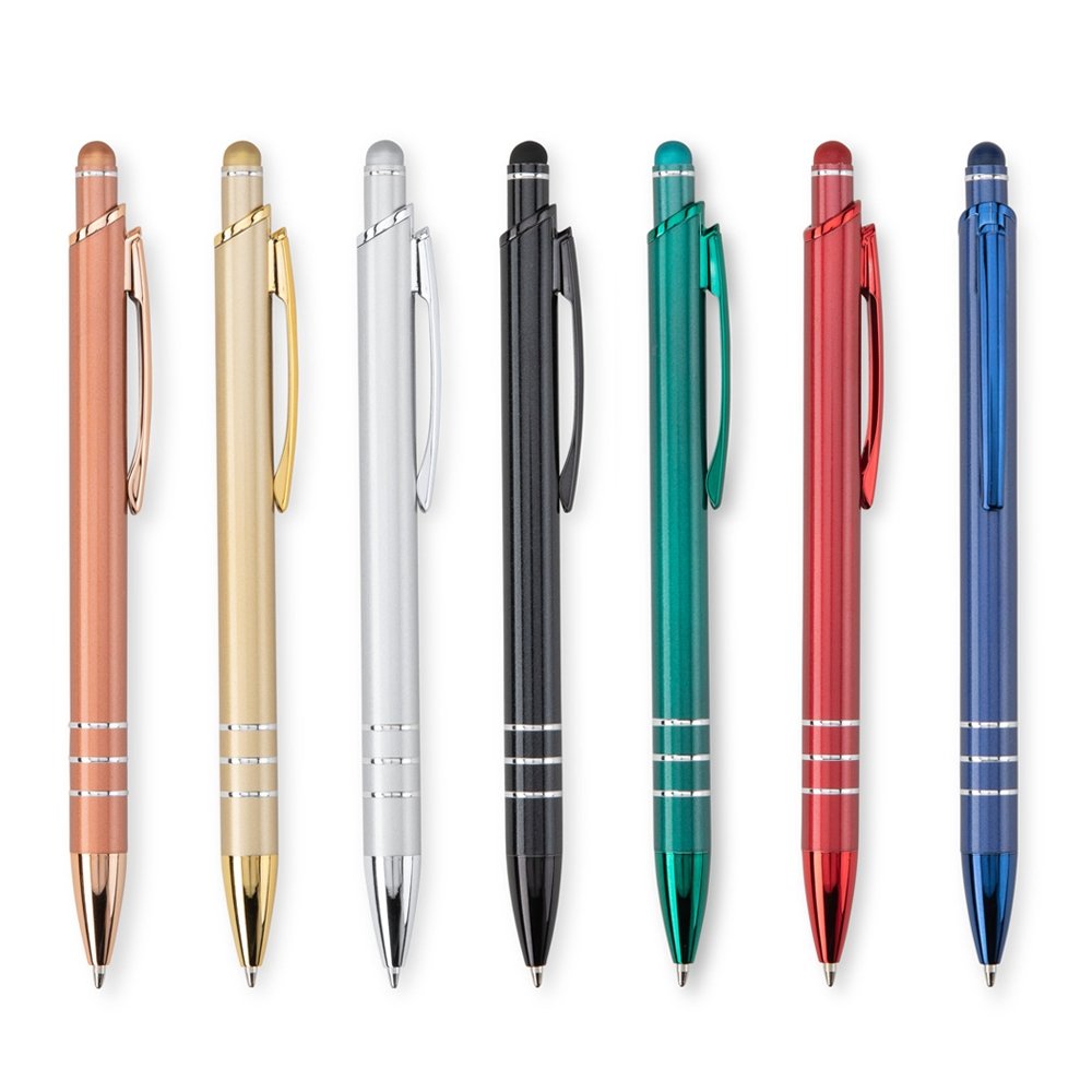 Descrição: Caneta metálica com ponteira em plástico, além de detalhes na parte inferior com dois anéis prateados e topo emborrachado para interação com dispositivos de telas sensíveis ao toque. Conta com acionamento por clique e carga esferográfica azul de 1,0 mm.