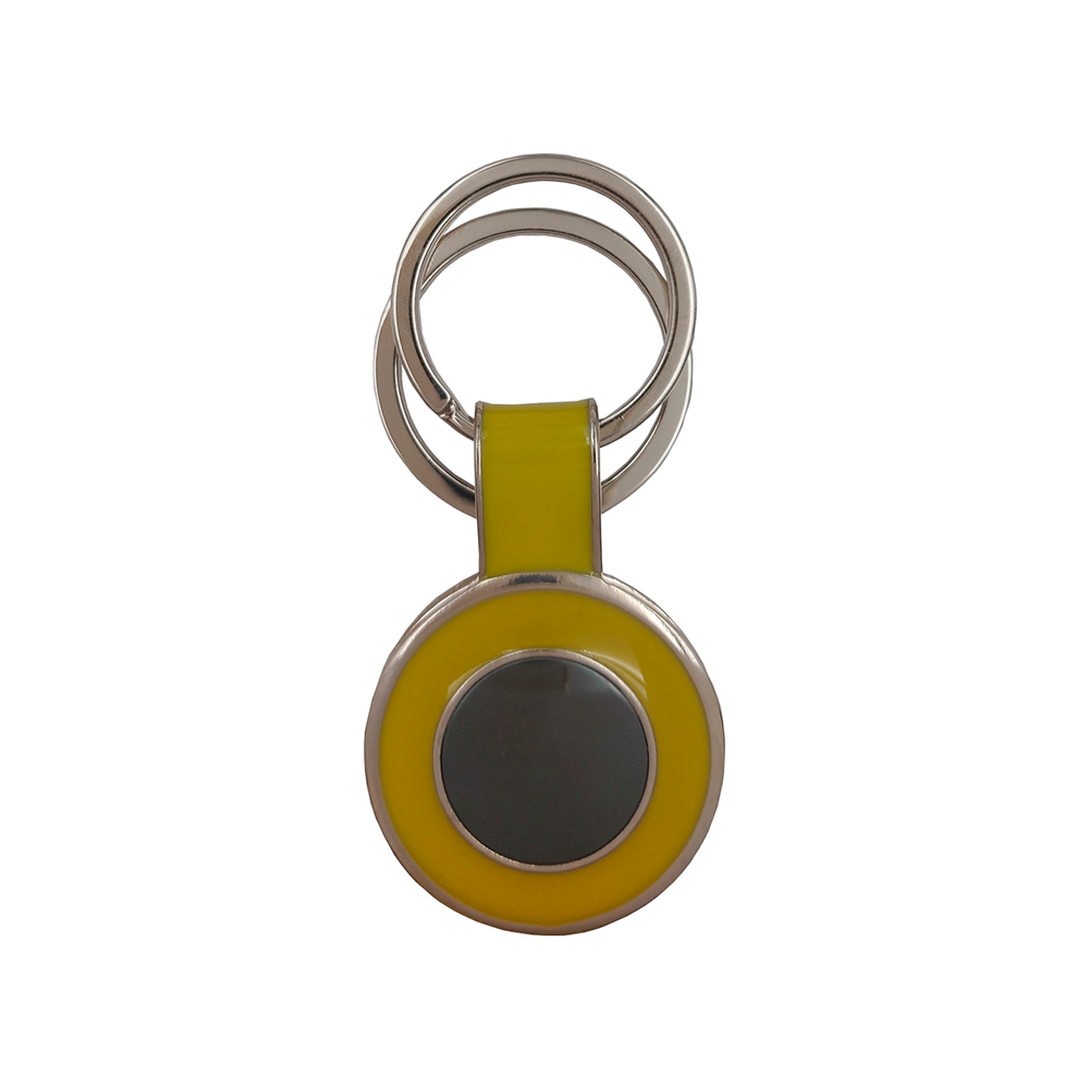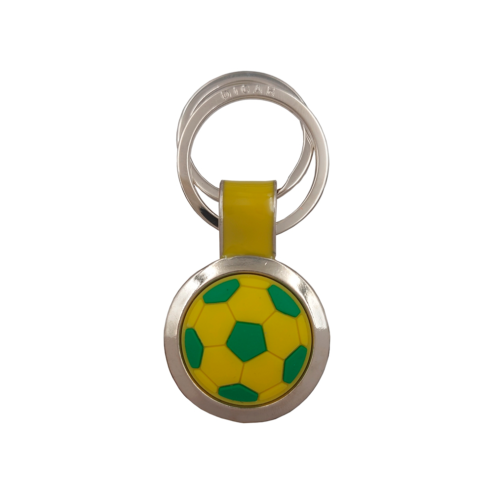 Descrição: Chaveiro bola de futebol CB 9550 em metal com acabamento emborrachado na parte frontal, na parte traseira uma borda e uma pare lisa sendo possível fazer gravação, 2 argolas para chaveiro em tamanhos diferentes.