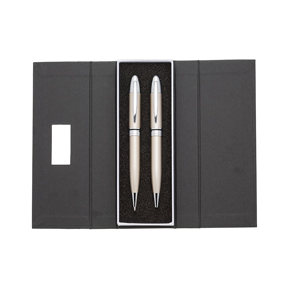 Descrição: Conjunto caneta e lapiseira metal CB ER 180 PAR em estojo de cartonagem com placa central para personalização. Clip metal e anel central possui: anel fino prata, anel preto fino e um anel maior prata com relevo e acionam por giro. Estojo revestida com espuma na parte interna.