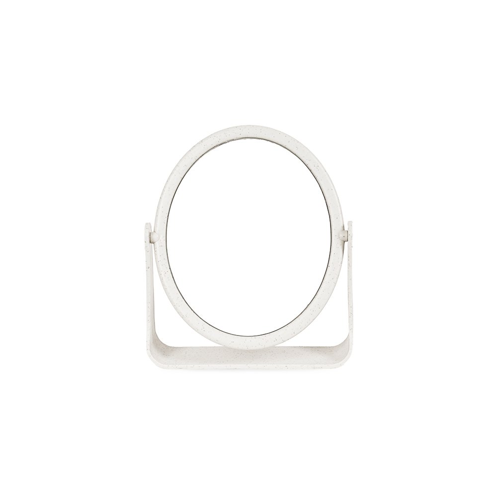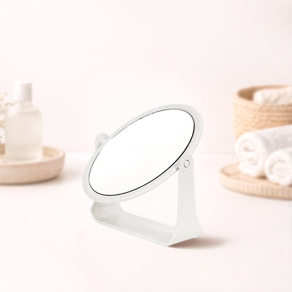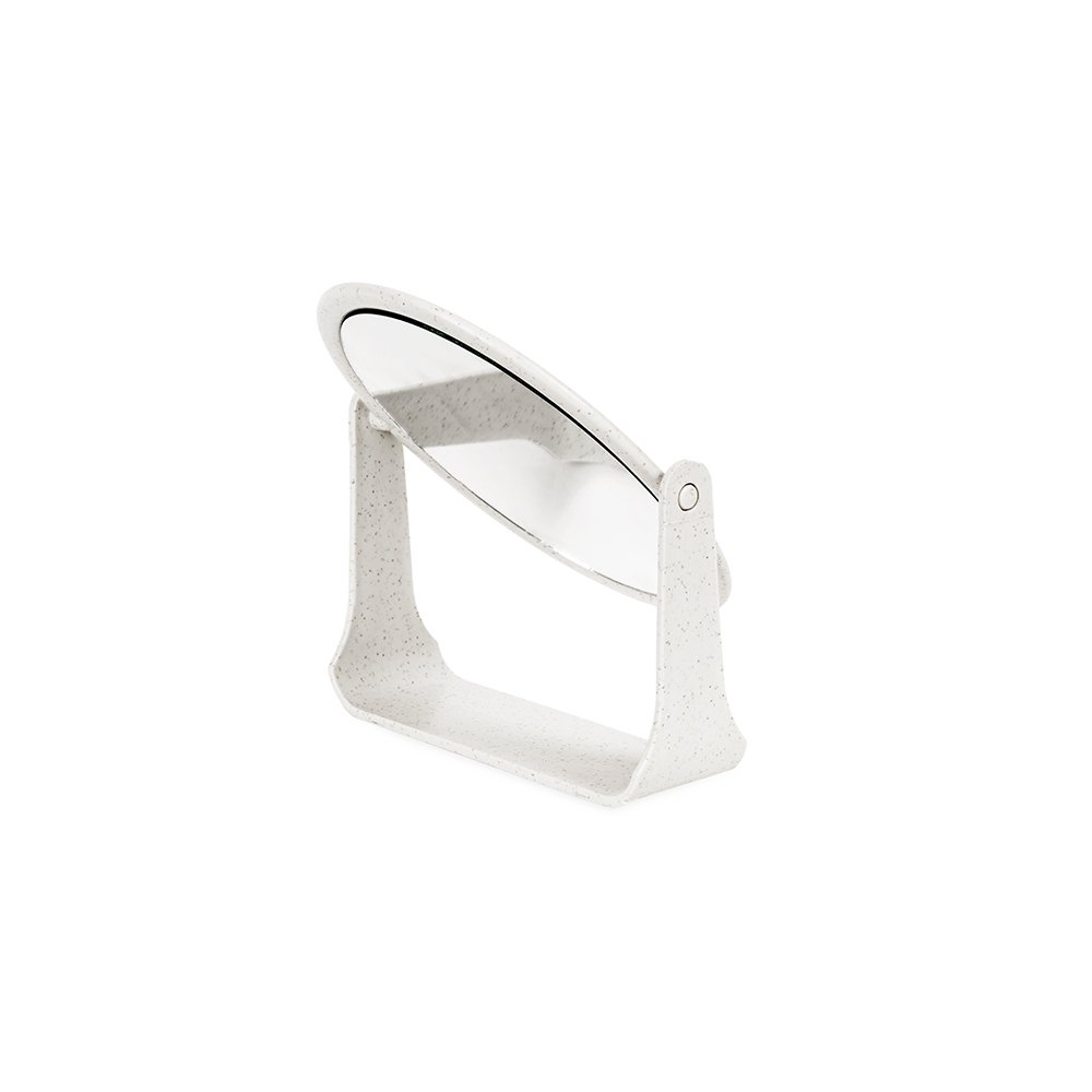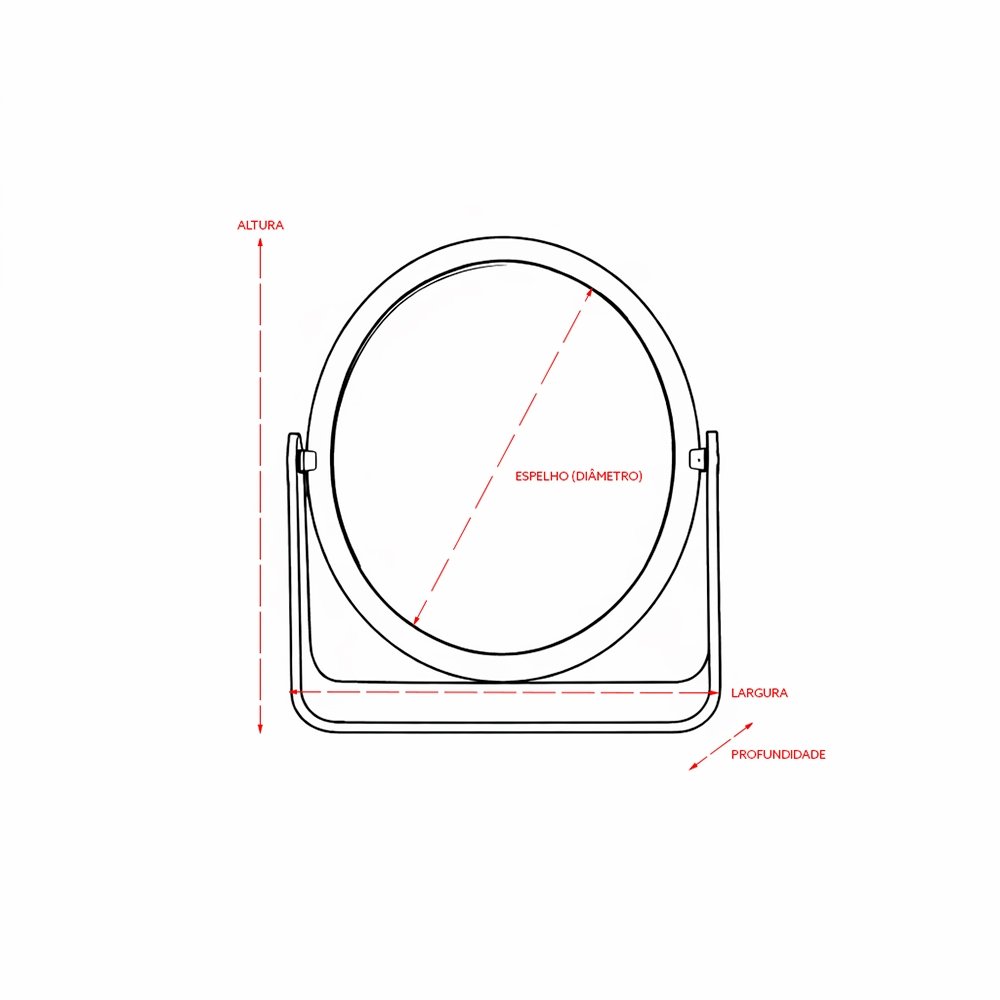 Descrição: Espelho de mesa CB 19094 oval dupla face, sem aumento, com moldura e base em plástico polipropileno (PP).