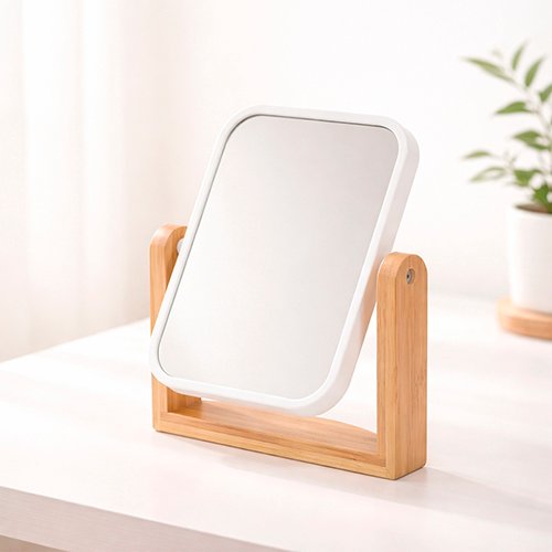 Descrição: Espelho de mesa CB 19101 giratório retangular com base em bambu e moldura em plástico polipropileno (PP).