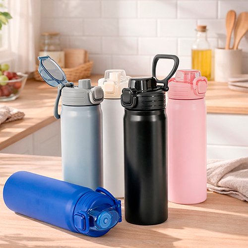 Em segundo lugar, a tampa rosqueável com trava de segurança protege o conteúdo e evita vazamentos, enquanto o botão de acionamento facilita a abertura da tampa protetora do bocal. Além disso, a alça para transporte amplia a praticidade no dia a dia e o canudo interno agrega conveniência ao consumo, incentivando o uso frequente e contínuo.