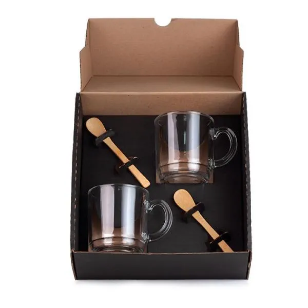 Descrição: Kit canecas 4 peças CB KT-9039F contendo duas canecas de vidro 300ml e duas colheres em bambu.