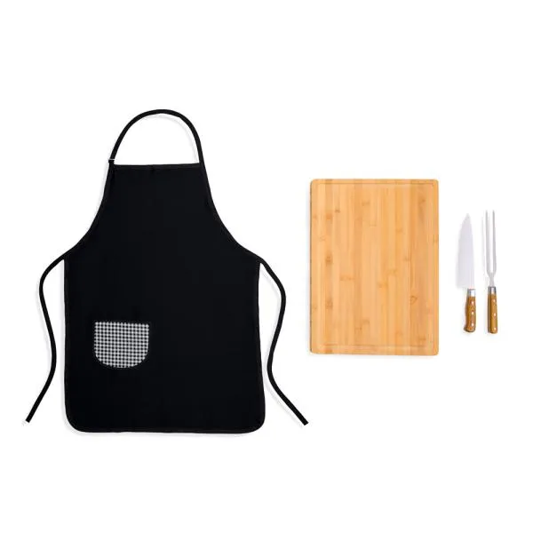 Descrição: Kit churrasco 4 peças CB ME-46373 composto por tábua em bambu para churrasco, faca e garfo premium em madeira/inox. Conta também com avental gourmet em brim preto.