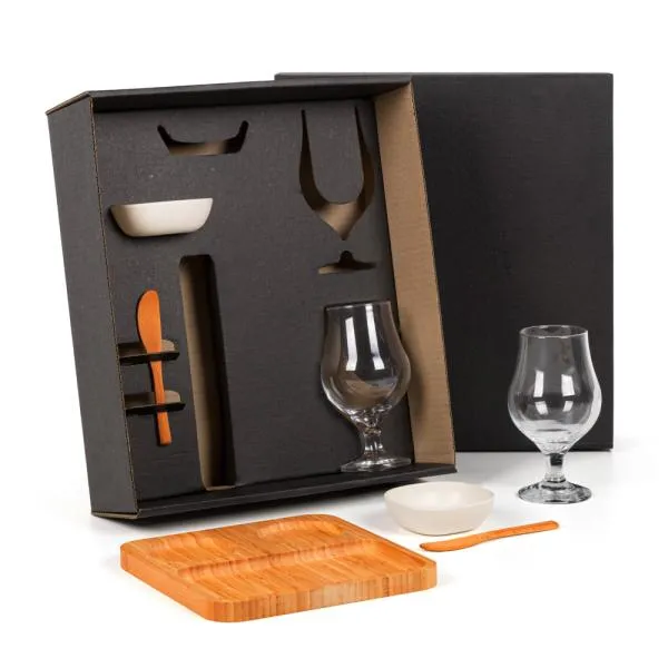 Descrição: Kit petisco, patê e cerveja 7 peças CB KT-9021B composto por uma tábua, uma espátula, dois potes em bambu e duas taças em vidro.