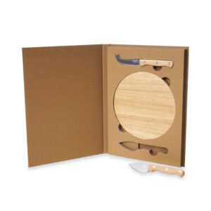 Descrição: Kit queijo 3 peças CB 8222 em estojo kraft . Contém faca com ponta, faca reta e tábua. Acompanha embalagem de papelão.