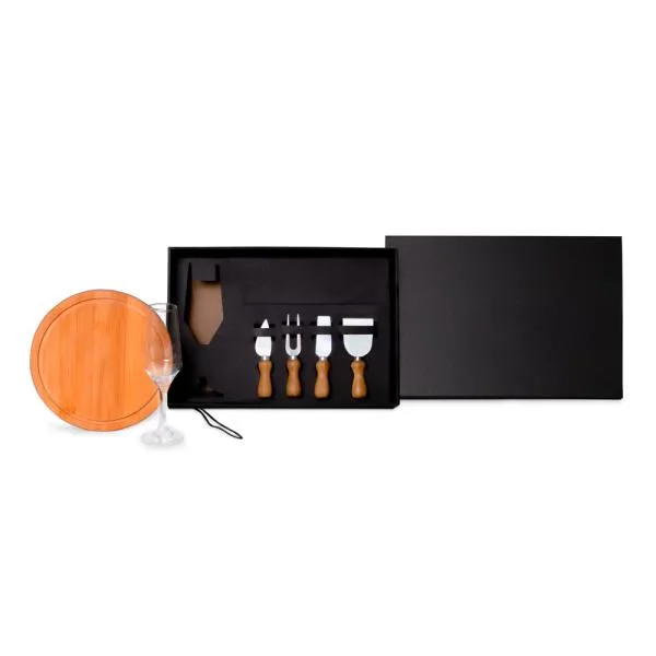 Em segundo lugar, a combinação de materiais garante durabilidade, resistência e praticidade no uso recorrente, ao mesmo tempo em que reforça um apelo sustentável e contemporâneo. Além disso, as duas facas, a espátula e o garfo para queijo atendem diferentes tipos de corte e serviço, enquanto a taça complementa o momento de consumo de forma elegante. Paralelamente, a possibilidade de personalização potencializa a exposição da marca com acabamento refinado e alta percepção de qualidade.