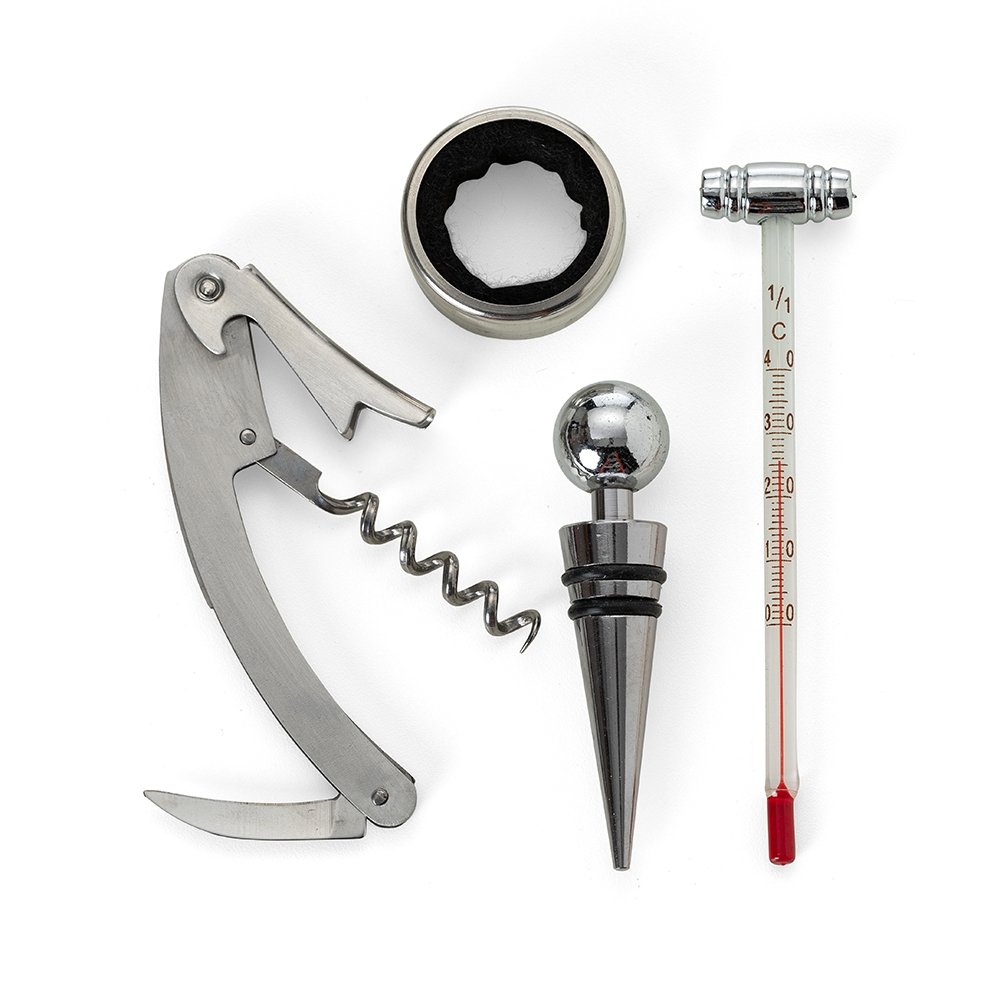 Descrição: Kit vinho 4 peças CB 14629 com estojo, parte interna revestida de espuma. Possui tampa de bico, saca rolha, termômetro e wine collar.