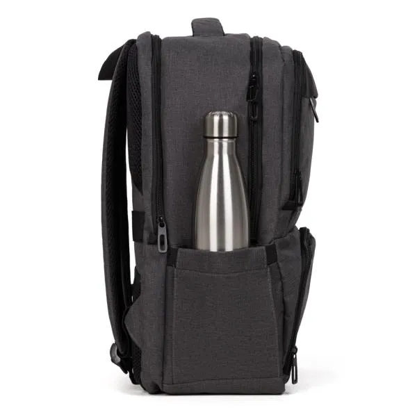 Descrição: Mochila com bolso térmico 24L CB MA-02912 em RPET. Conta com alças para as costas, alça para as mãos e alça carona para mala. Composta também por bolsos laterais com elástico para melhor ajuste, compartimento frontal térmico com rede para organização interna, compartimento frontal menor, compartimento principal e na parte traseira conta com compartimento aveludado para notebook com fecho em velcro. Sendo o compartimento principal com zíper duplo cursor e todos os outros com zíper de cursor simples. Bolso térmico: 6,5L.