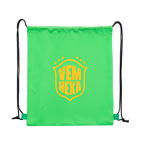 Descrição: Mochila saco Copa do Mundo multifuncional em poliéster impermeável com cordões de nylon que servem tanto para fechamento quanto como alças de costas.