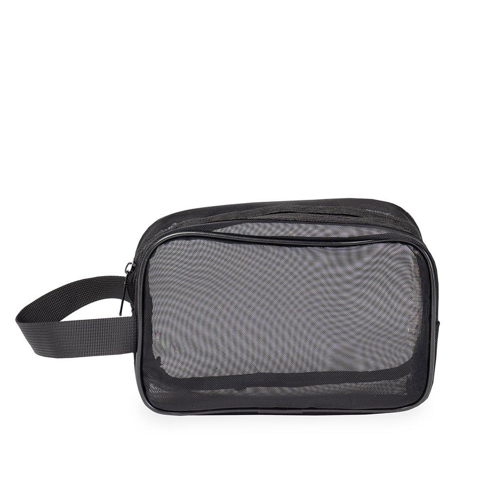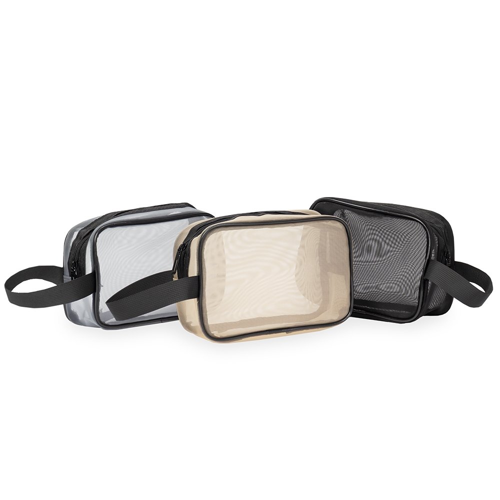 Descrição: Nécessaire de malha CB 19051 confeccionada em tela de nylon com fechamento em zíper e alça lateral para transporte.