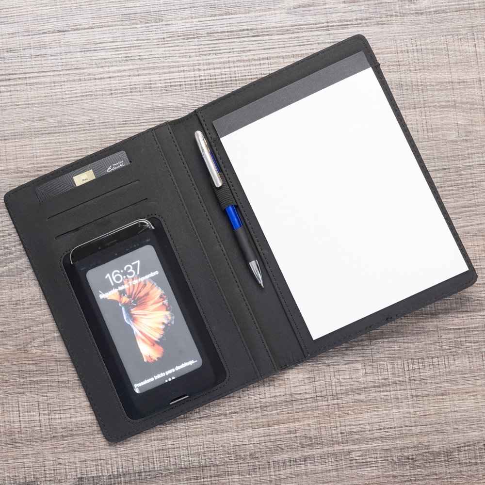 Pasta convenção com porta celular CB 13485 pequena de couro sintético. Possui “bolso” para arquivar documentos, porta celular com visor fosco, três divisórias para cartões, suporte elástico para caneta (não acompanha) e bloco com aproximadamente 20 folhas brancas pautadas de verso liso.