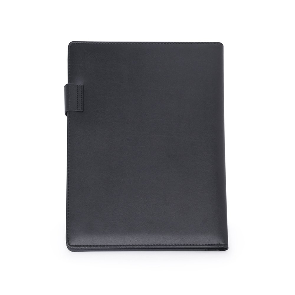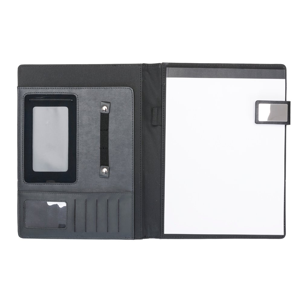 Pasta convenção de couro sintético CB 13486 com trava de imã lateral, possui uma placa de metal na trava ideal para personalização. Possui “bolso” para arquivar documentos, porta celular com visor fosco, porta cartões com divisórias e visor além de um bolso atrás, suporte elástico para caneta(não acompanha) e bloco A4 com aproximadamente 20 folhas brancas pautadas de verso liso.