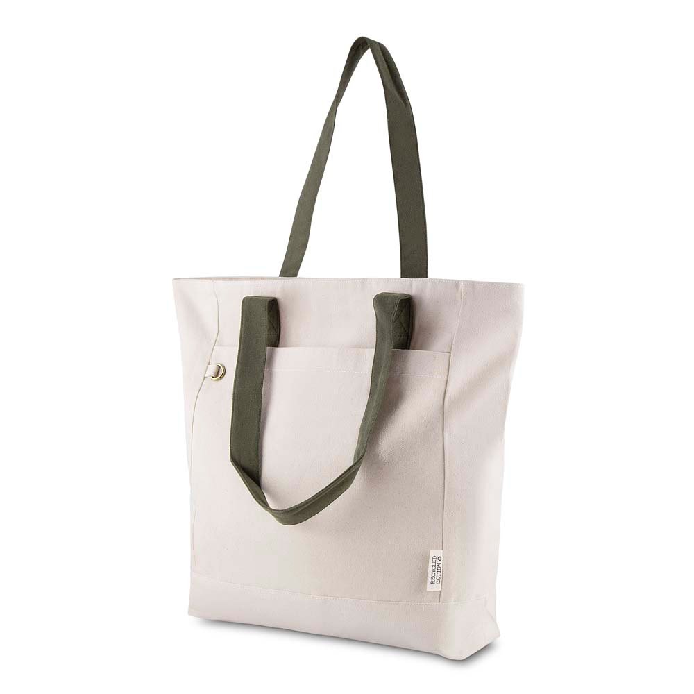 Descrição: Sacola em algodão CB BAC 019 reciclado, gramatura 280 g/m², resistente e sustentável. Possui bolso frontal e alça de 50 cm ponta a ponta e conta com fechamento por zíper no compartimento principal.