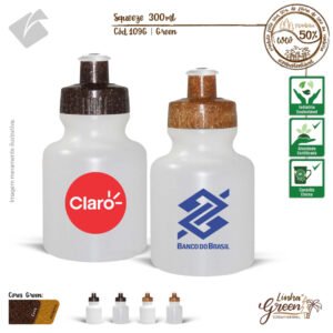 Descrição: Squeeze 300ml green CB 109G feita com 50% de Fibra Natural de Coco ou Madeira e 50% Plástico Premium (PE) com bico em PVC cristal atóxicos. Tampas ecossustentáveis com acabamento e vedação impecável. Tamanho ideal para público infantil.